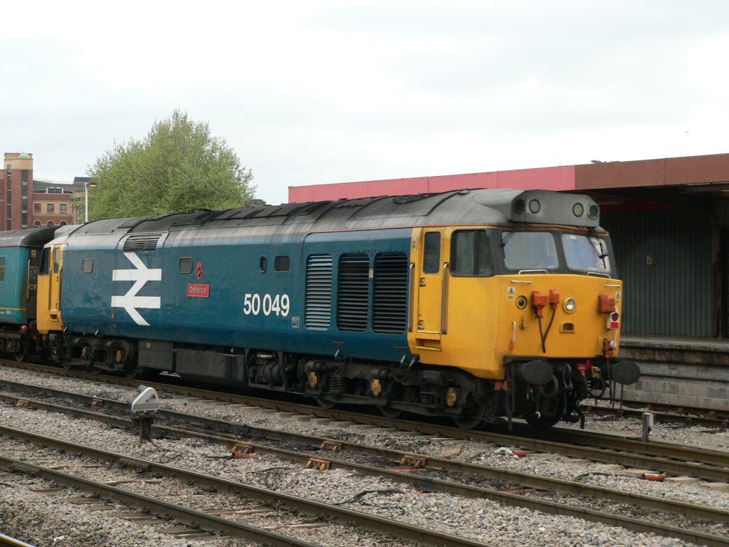 Class 50 diesel locomotive 50049 Defiance, presently on hire to Arriva Trains Wales from the Severn Valley Railway, runs light engine eastbound through Newport station in South Wales.