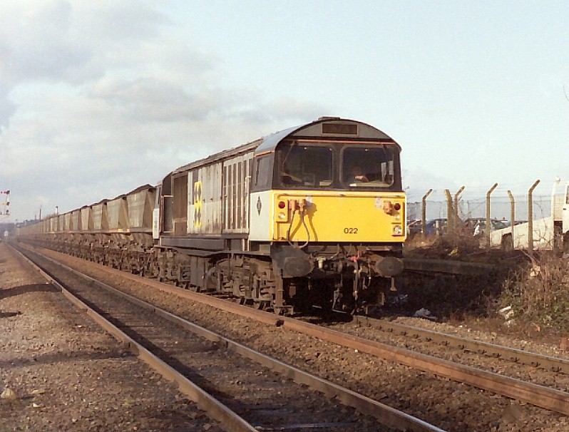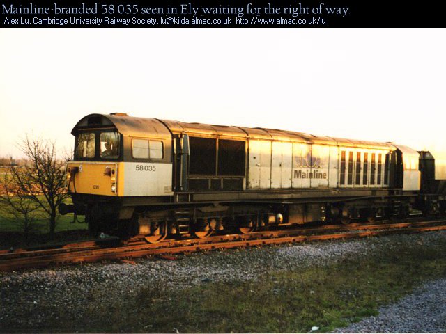 class 58 Mainline cement train waiting for the right of way in Ely station, having just joined the mainline to Peterborough from a branch. An interesting story comes with this photograph: The 'Networker' aboard which I travelled to Ely ran alongside this 58 for almost half a mile prior to the station stop, and overtook each other a couple times before finally arriving in the station, during which my seat happened to flash past the driver's window a couple times. Sitting in the seat opposite was a group of four A-level girls intending to do psychology at university, however it was most fascinating for me to observe their actions and draw conclusions about their psycology as they gestured the driver aboard the 58, who duly responded with a blast on the horn of his locomotive. As I photographed the 58, the driver decided to photograph me photographing the 58... Photo by Alex Lu, Cambridge University Railway Society. (lu@kilda.almac.co.uk, http://www.almac.co.uk/lu, http://aperto.home.ml.org) |