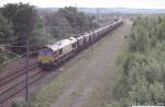 EWS Class 66. Awaiting it's next turn of duty which will not take place until Monday 66042 stands silent in Millerhill Yard a rake of empty M.G.R (coal) wagons on Sunday 8th August 1999.