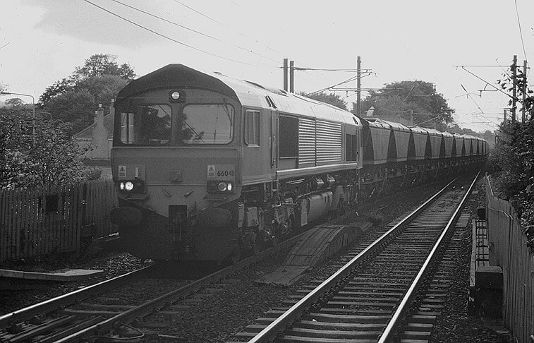 EWS Class 66. 66041 departs Millerhill, Edinburgh at with an unidentified westbound coal (M.G.R) service on Fri 4th June 1999 at 07:55.