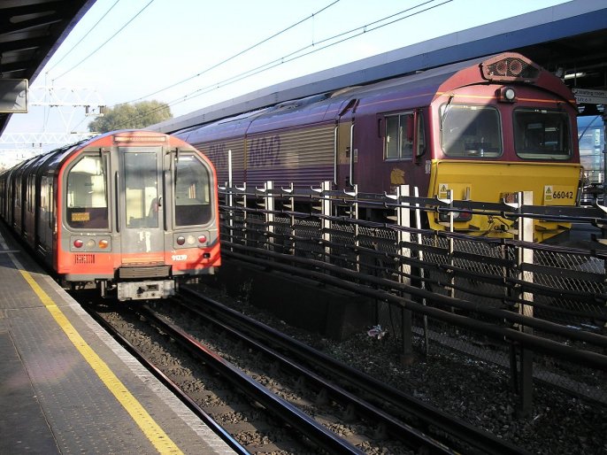 The 'Shed' 66042 has run into platform 5 and will then reverse whilst on 6 there is an eastbound Central Line train departing. Pictured on the