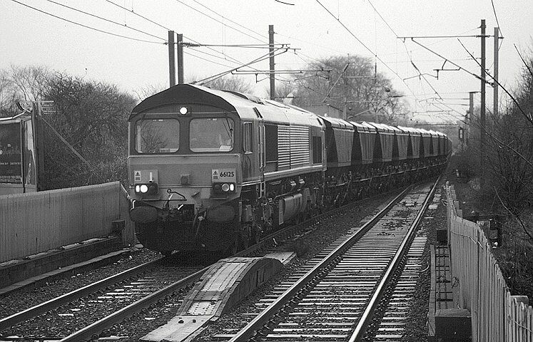 EWS Class 66 66125 approaches Slateford station in Edinburgh with an unidentified eastbound M.G.R (coal) train on Monday 10th January 2000 @ 13:44.