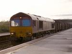 An EWS diesel loco class 66 66184 is seen heading west of Scunthorpe station with some EWS HTA bogie coal hopper wagons in transit on platform 2. Bank Holiday Monday the 26th of May 2008