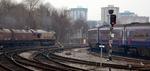 EWS Class 66 diesel loco 66221 hauls a northbound freight service northbound out of Bristol Temple Meads towards Bristol Parkway or Avonmouth, while a First Great Western HST departs towards Bath Spa with an express to London Paddington.