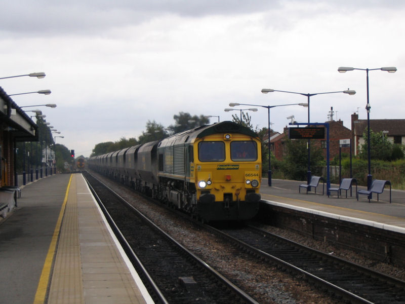 A Freightliner Heavy Haul diesel loco class 66 66544 is seen heading south of Brough station (East Riding of Yorkshire area) with a Freightliner Heavy Haul HHA bogie hopper wagon freight train in transit on platform 2. Wednesday the 19th of September 2007