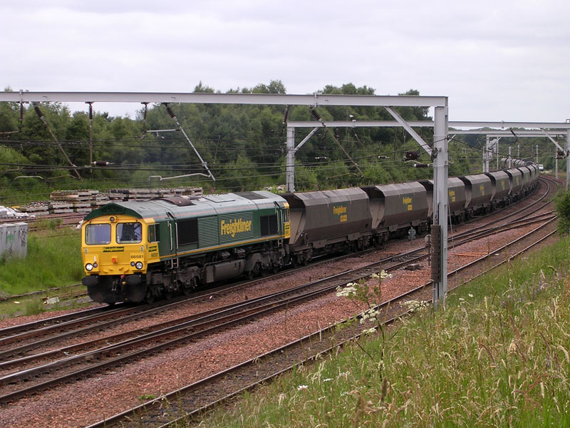 Freightliner Class 66/5 Freightliner Class 66/5 - 66581 approaches Carstairs with an unidentified loaded 'Heavy Haul' coal working from Ravenstruther on Fri 15th July 2005 at 13:35.
