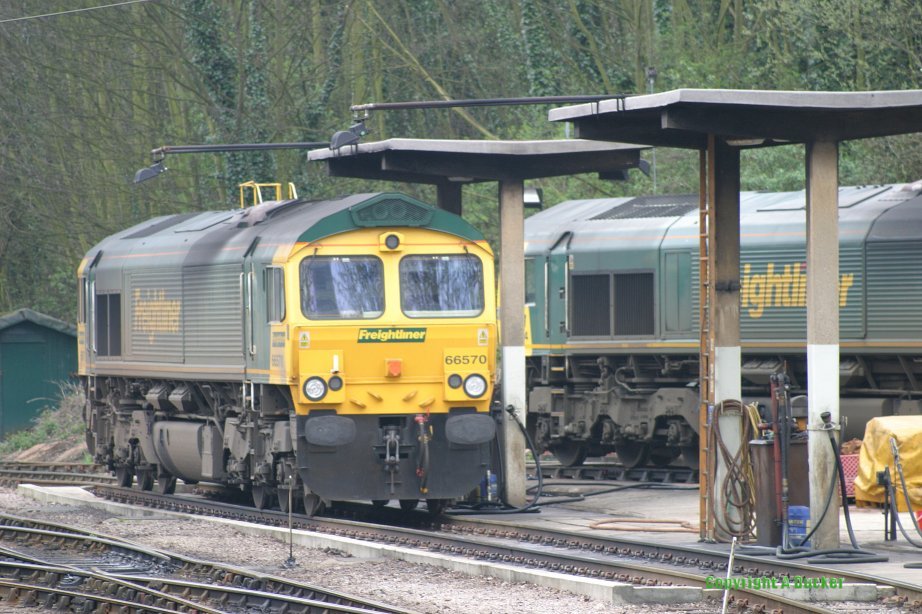 Freightliners 66570 runs through Gospel Oak on the 13th January 2005.