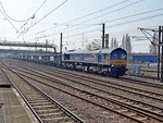 GB Railfreight / Metronet Class 66 diesel locomotive 66721 heads northbound through Harrow and Wealdstone station in north London with a container freight train. These locomotives were purchased by London Undground PPP infraco Metronet for heavy engineering duties on the sub-surface lines of London Undergound.
