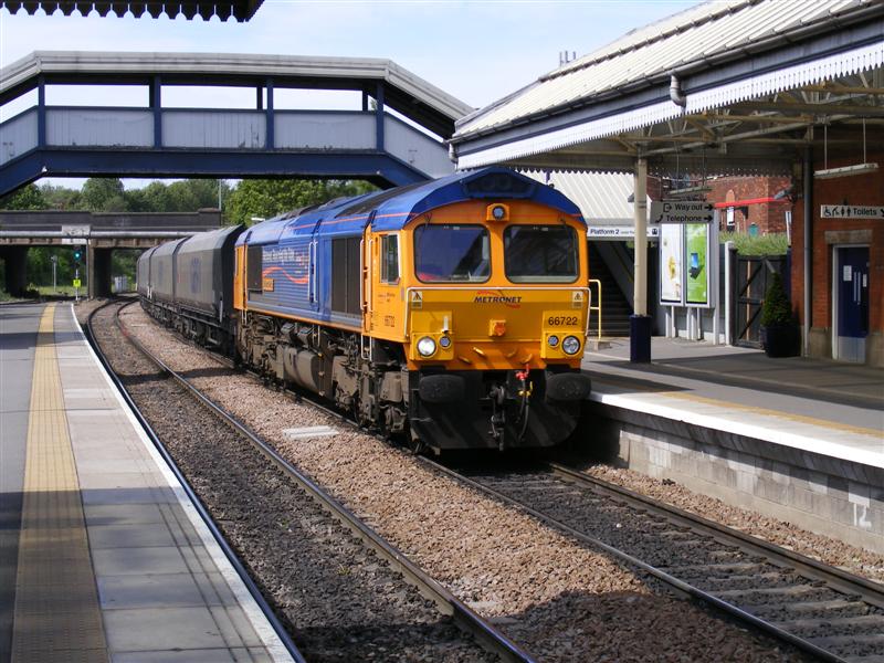 A GB Railfreight / Metronet diesel loco class 66 66722 is seen heading east of Scunthorpe station with an eastbound First GBRf coal freight train in transit on platform 1. Bank Holiday Monday the 26th of May 2008