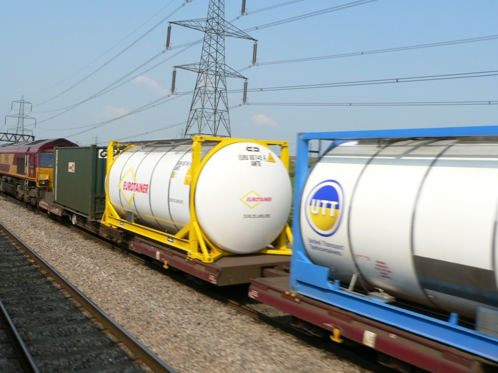 An EWS Class 66 deisel locomotive hauls various chemical tannker wagons east along the South Wales Main Line east of Cardiff Central, viewed from the window at the front of Coach A on a First Great Western HST heading eastbound to London Paddington.