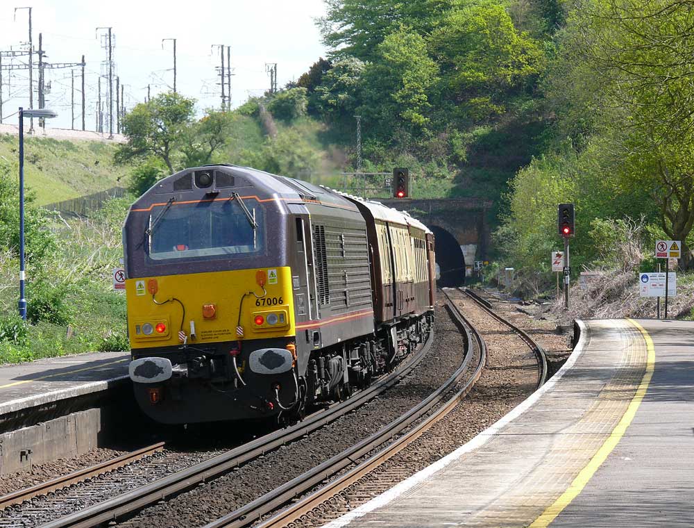 | EWS 67 006 at the rear of the VSOE at Sandling, Kent, 5 May, 2009. D h Thomas thomdh@hotmail.com |
