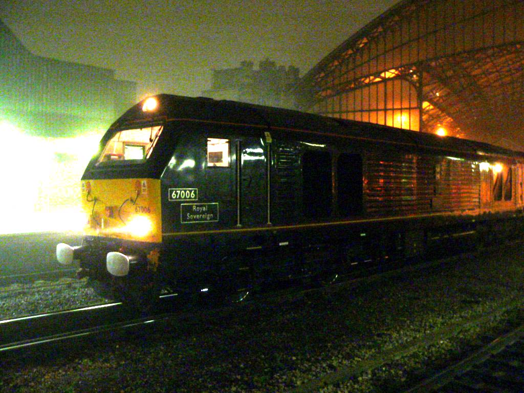 Class 67006 Royal Sovereign at the head of the Royal Train at Bristol Temple Meads on a very foggy November night.
