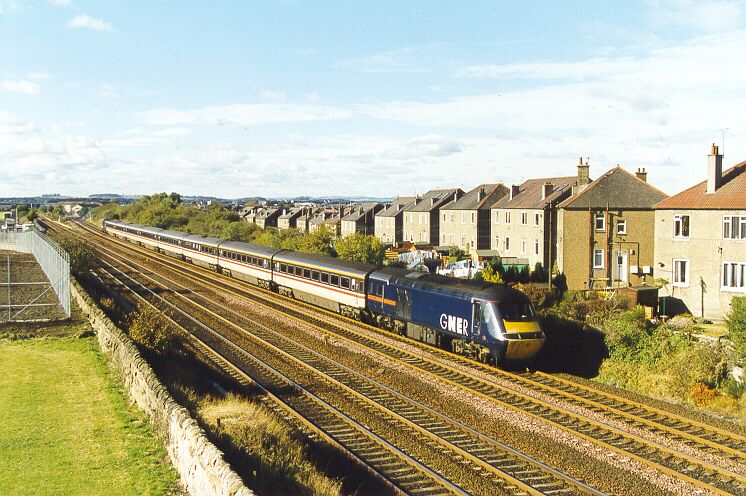 Class 43. 43039 (with 43096 at the rear ) passes eastbound at Carrick Knowe, Edinburgh on 12-oct-97 at 12:18.