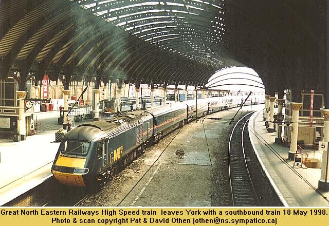 Great North Eastern High Speed Train leaves York station southbound on 18 May 1998. Copyright Pat & David Othen (othen@ns.sympatico.ca) othen@ns.sympatico.ca |