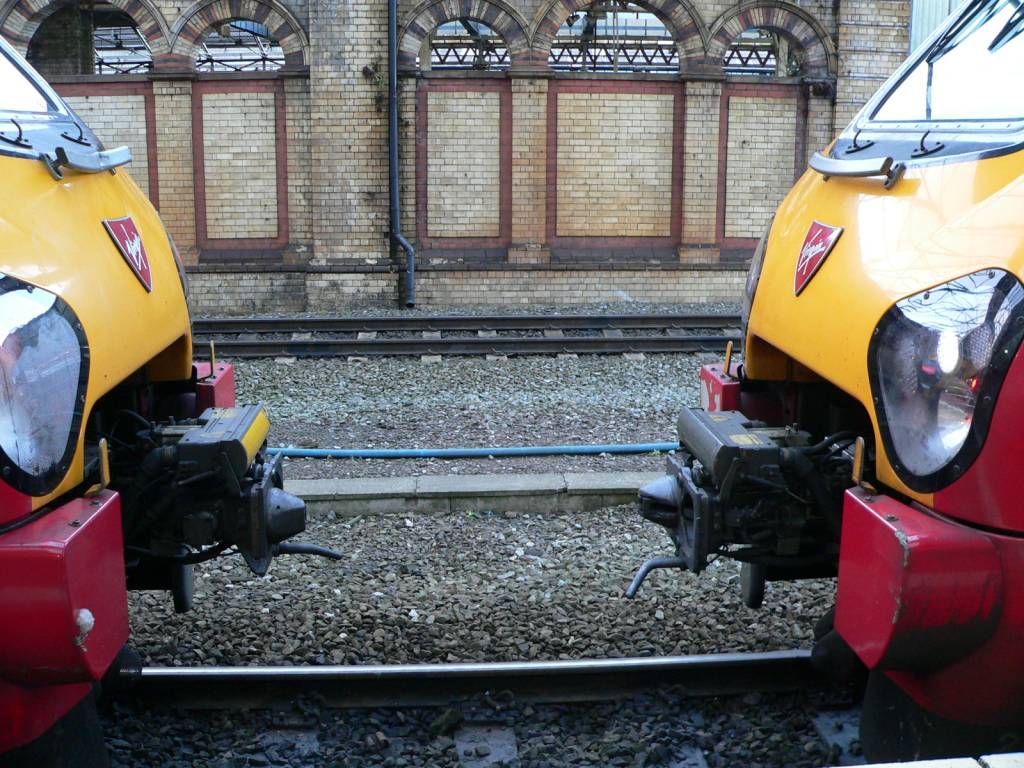 Two Class 221 Virgin Voyagers nose to nose at Platform 12 of Crewe station. 221132 William Speirs Bruce is on the left, while 221136 Yuri Gagarin is on the right. I originally took this photo in anticipation of the units being coupled together, but in the end this did not happen (or at least not before my train departed from the opposite side of the station).