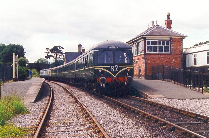 Class 105+127 hybrid 2-Car DMU. Another view, while capturing the whole of the signal box this time, of the six car DMU formation, consisting of Green Class 105+127 hybrid 2-car DMU, No: 56456+51618, Green 2-car Class 104, No: 50528+50454 & BR Blue/Grey 2-car Class 108, No: 54490+51907, while at Carrog, On the Llangollen Railway during the DMU owners convention held here, with the 15:00 Carrog - Llangollen service on Sunday 28th June 1998 at 14:50.