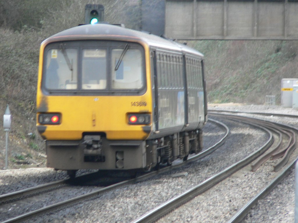 First Great Western Class 143 railbus DMU 143618 viewed from the southbound First Great Western HST that had to wait for this unit to clear the single track section of the Weston Super Mare loop between Weston Super Mare station and Worle Junction.