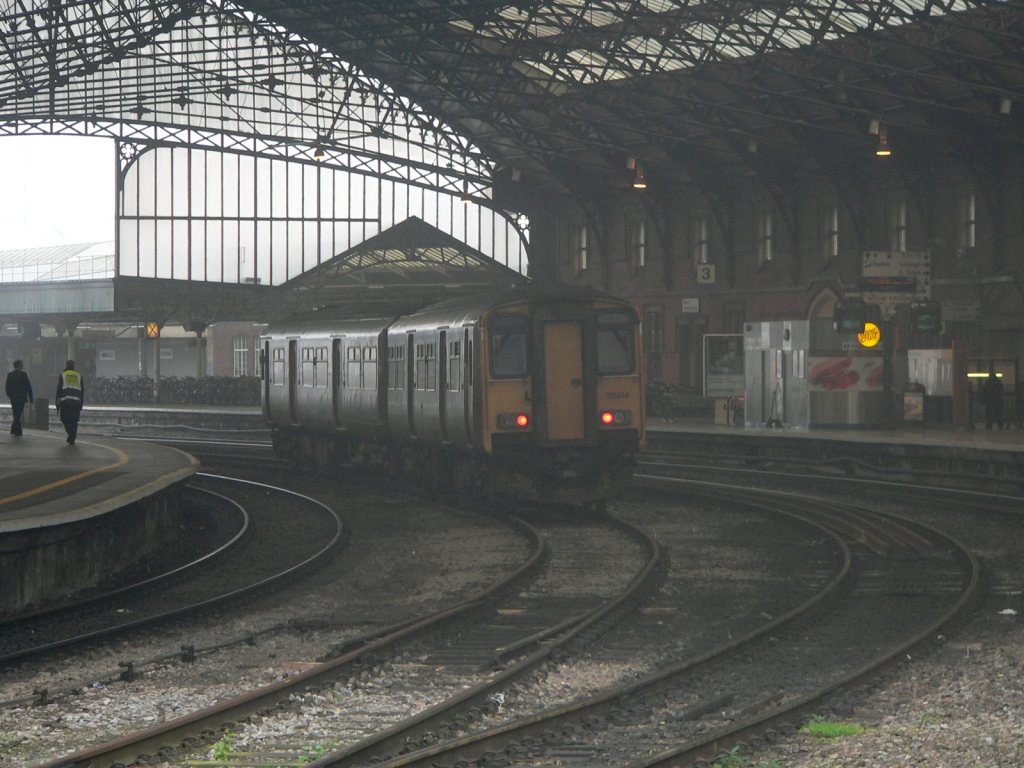 Newport station in South Wales - First Great Western Class 150/2 DMU 150243 at the rear of a service from Cardiff Central to Paignton. Because Rugby Union's Heineken Cup final between Munster and Biarritz was taking place at Cardiff's Millennium Stadium this service was strengthed to comprise two Class 150/2 DMUs and a Class 158 DMU for a total of 6 carriages.