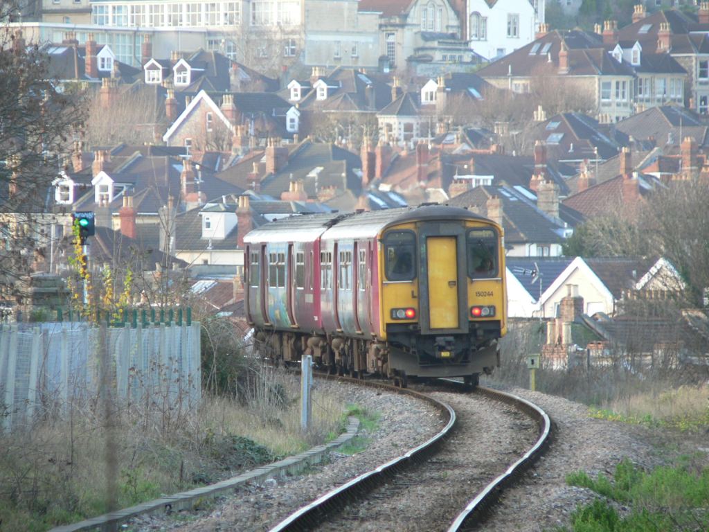 First Great Western Class 150 DMU 150244 heads towards Redland staiton, visible in the distance in this very foreshortened image, very shortly after departing Clifton Down railway station in Bristol with a Severn Beach Line service bound for Bristol Temple Meads.