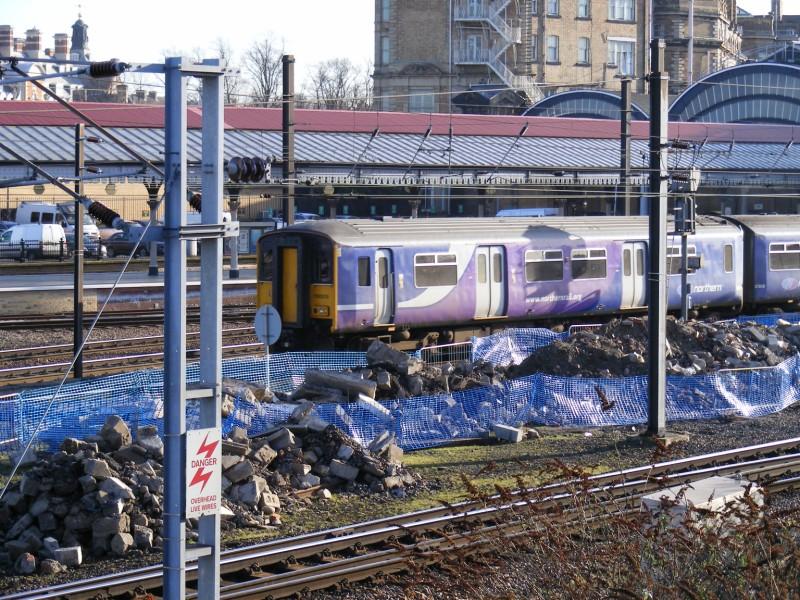 A Northern Rail DMU-2 Sprinter class 150 150215 is seen pulling out of York station with a northbound service to Harrogate. This photograph was taken from the elevated platform of the National Railway Museum. Wednesday the 21st of January 2009