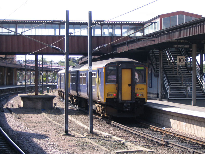 A Northern DMU-2 class 150 150223 is seen standing on platform 10 at York station. This unit is towing the Northern DMU-2 class 150 150145 at the rear and is working the 12:11 service to Burley Park via Harrogate. This photograph was taken on a bank holiday Monday the 27th of August 2007