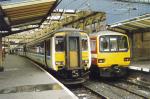 Class 156 2-car DMU 156487 with an unidentified Class 142 2-car DMU behind, at Carlisle on 23-aug-97.