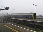An unidentified Class 158 unit arrives into Bristol Temple Meads from the north on a misty day. This unit, on hire to First Great Western from First TransPennine Express is still in Regional Railways Express livery, with a Frist TransPennine Express vinyl skirt up to window level.