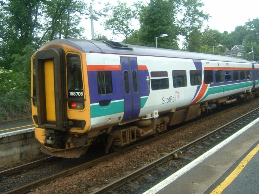 Class 158 DMU of First Scotrail, seen on a Glasgow Queen Street ---> Dunblane semi-fast service, while calling at Bridge of Allan.