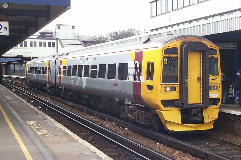 First Great Western Class 158 DMU 158747 in a livery celebrating the bicentenary of rail travel and centenary of the first 100mph locomotive in 2004. This livery was first applied by Wessex Trains, although their branding has been removed by FGW nothing else has been changed (yet?).