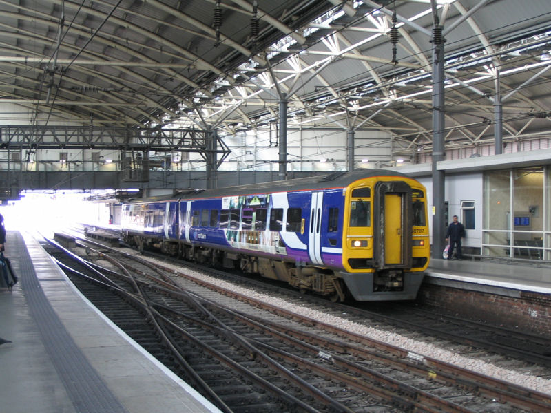 A Northern DMU class 158 158787 is seen standing on platform 12D at Leeds station. This unit works the 13:51 service to Blackpool North. Friday the 25th of May 2007