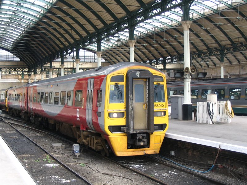 A Northern DMU class 158 158908 is seen standing on platform 1 at York station. This unit will begin a service with the 17:18 to Hull. Saturday the 5th of May 2007