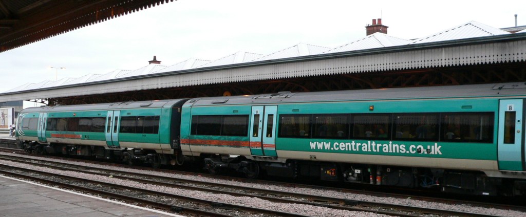 Central Trains class 170 Diesel Multiple Unit 170108 at Nottingham Station. The livery is not a standard one for Central Trains, and the colours lead me to suspect it was formerly operated by Midland Mainline, with their branding removed and Central Trains' added.