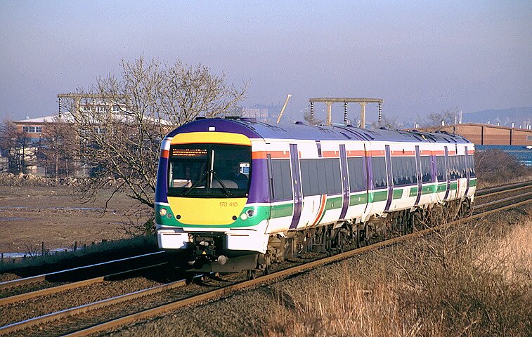 Scotrail Class 170/4, 3-car DMU First Scotrail Class 170/4 - 170407 passes Edinburgh Airport at Turnhouse with an unidentified Edinburgh bound 'First Scotrail' service on Sat 18th Nov 2006 at 13:42.