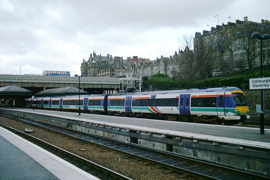 6 Feb 2000, Edinburgh Waverley Station, Scotland DMU 170 405 in Scotrail livery departing for Glasgow. These three-coach DMUs were ordered for the new quarter-hourly Edinburgh-Glasgow service.