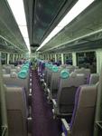 The interior of coach C of Arriva Trains Wales Class 175 DMU 175110, photographed looking towards the centre of the train. Although the exterior of this unit has been repainted into Arriva's pale blue and white livery, the interior remains decorated in the purple of original operator First North Western's corporte identity.