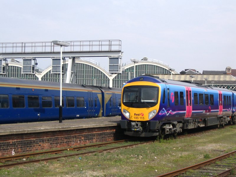 A Transpennine Express DMU class 185 185123 is seen standing on platform 11 at York station. This unit is on a service with the 14:54 to Newcastle Central. Saturday the 5th of May 2007
