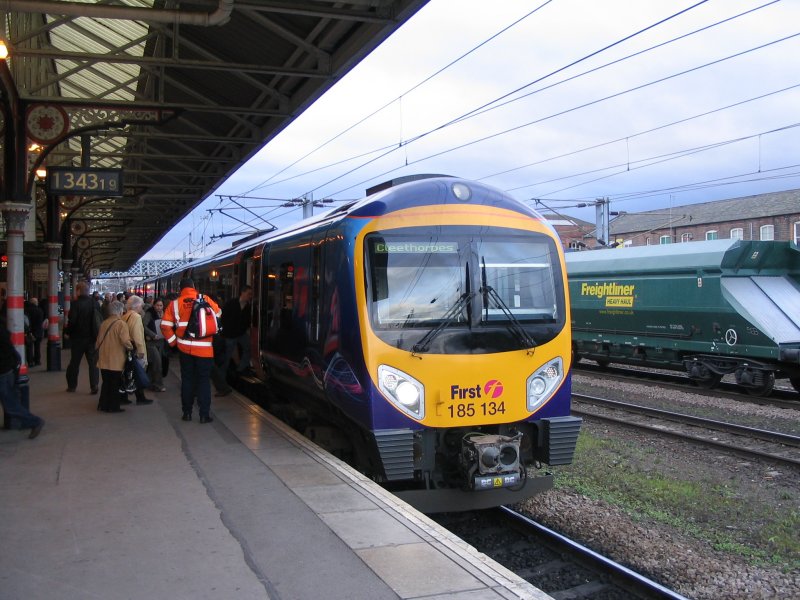 A First Transpennine Express DMU-3 Desiro UK class 185 185134 is seen standing on platform 2 at Scunthorpe station. This unit is working the 11:10 service to Meadowhall. Bank Holiday Monday the 26th of May 2008