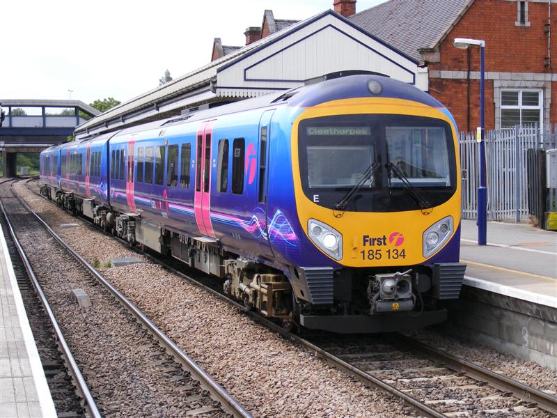 A First Transpennine Express DMU-3 Desiro UK class 185 185134 is seen standing on platform 1 at Scunthorpe station. This unit is working the 13:08 service to Cleethorpes. Bank Holiday Monday the 26th of May 2008