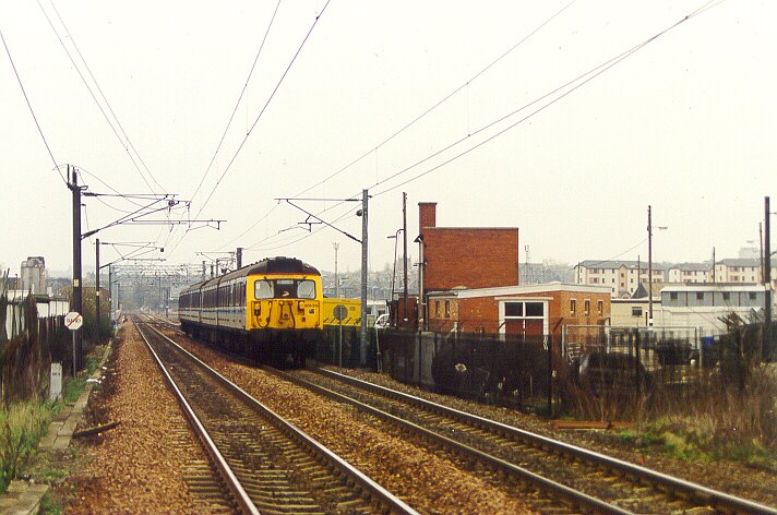 305 501's side on view standing at Edinburgh Waverly with a service to North Berwick in September 2001. The 305s never got painted into the ScotRail livery. With the 334s now introduced these units are getting replaced by the 318s and 322s.