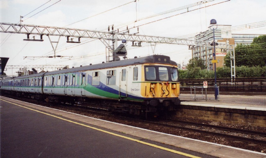 A First Great Eastern 312 EMU approahes Stratford in the Summer of 2002 on what appears