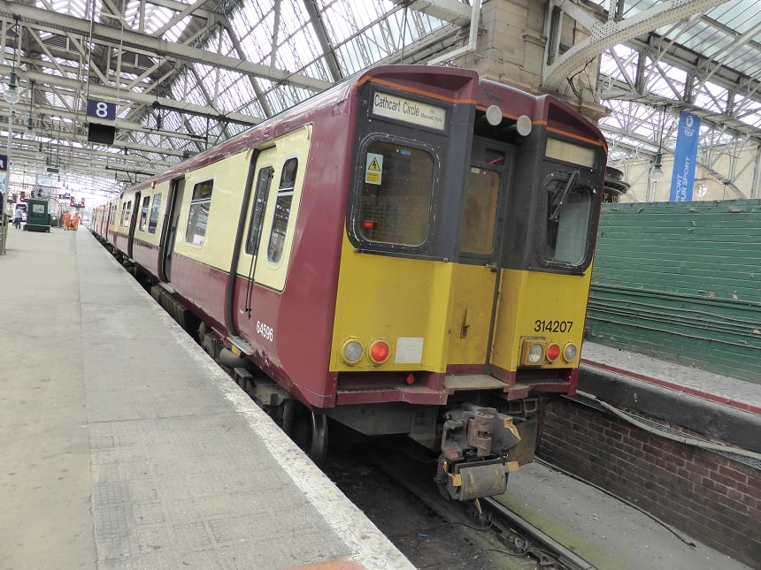 314 207 at Glasgow Central, getting ready to depart with the 11:35 service to Newton, calling at Pollokshields West, Maxwell Park, Shawlands, Pollokshaws East, Langside, King's Park, Croftfoot, Burnside, Kirkhill and Newton.