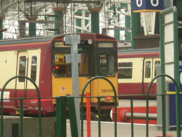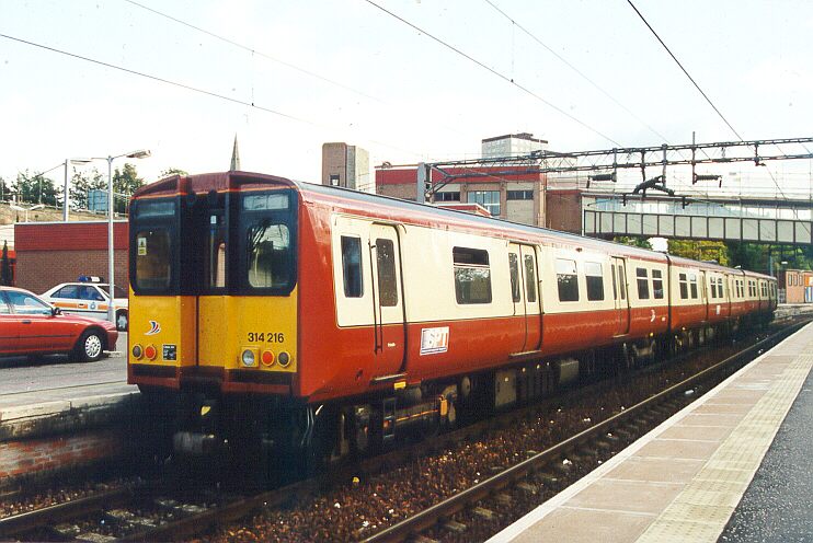 314 214 at Glasgow Central going to Neilston on 16th July 2004. As seen this is a recently repainted unit from the SPTE orange and black livery with the new SPT rail logo