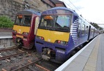 320310 and 320320 at Springburn station on Monday, 12th, August, 2013.