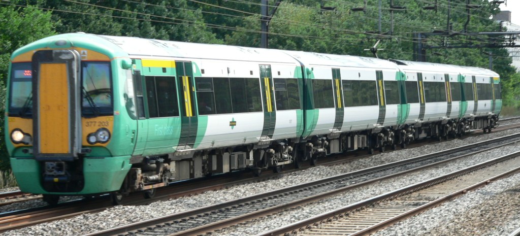 A new class 377 operated by 'Southern' approaches Kensington Olympia on