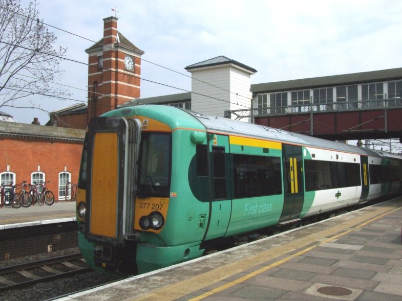 377209 at Barnham station operating 1C35 1256 Bognor Regis & Southampton Central to London Victoria on Friday, 21st April, 2023. Another unit, starting its journey at Southampton Central, would be attached at Horsham.