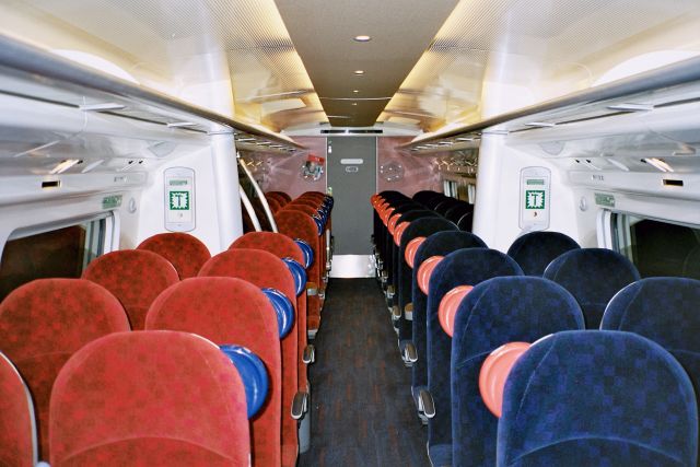 Standard-class interiors of a Pendolino 390 of Virgin West Coast seen at London-Euston, upon arrival from Manchester-Piccadilly.