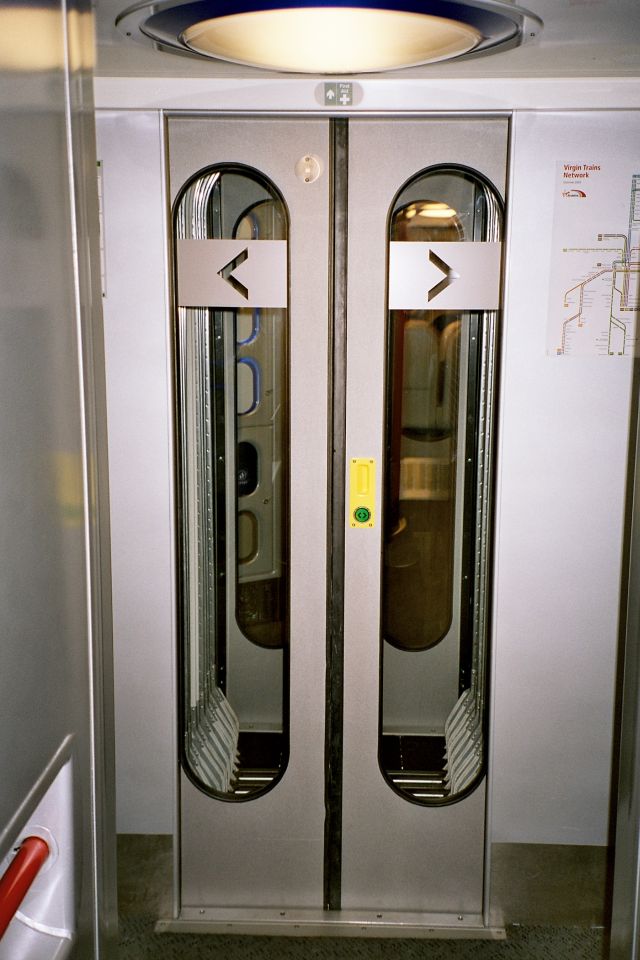 Internal door to the vestibule of a Pendolino 390 of Virgin West Coast seen at London-Euston, upon arrival from Manchester-Piccadilly.