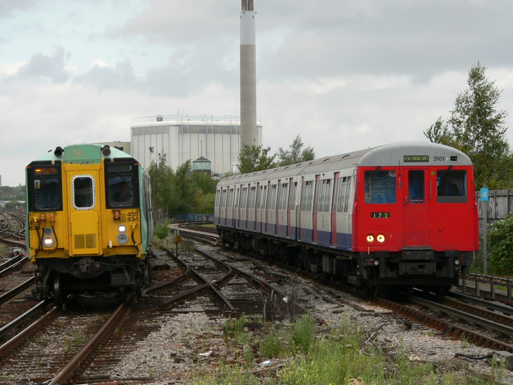 Southern Class 455 EMU 455834 and London Underground A-stock EMU 5101 approach New Cross Gate station in south London with southbound services.