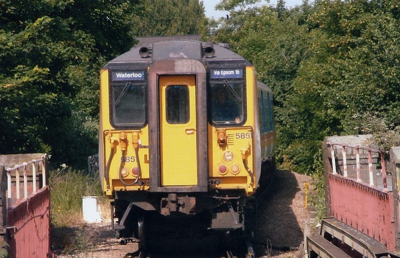Class 455 arriving at Staines Station. Note the livery is the first attempt at Stagecoach livery and is based on the Network South East 'toothpaste' livery, using the Stagecoach colours. It it is interesing to note that this first version of corporate was to be applied to all units including express units such as the Wessex 442 units.