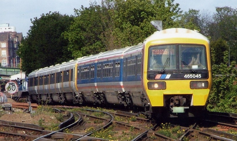 465007 departing from London Bridge o the 14 February 1998. The Connex South Eastern livery has been applied over the NSE livery using transfers.